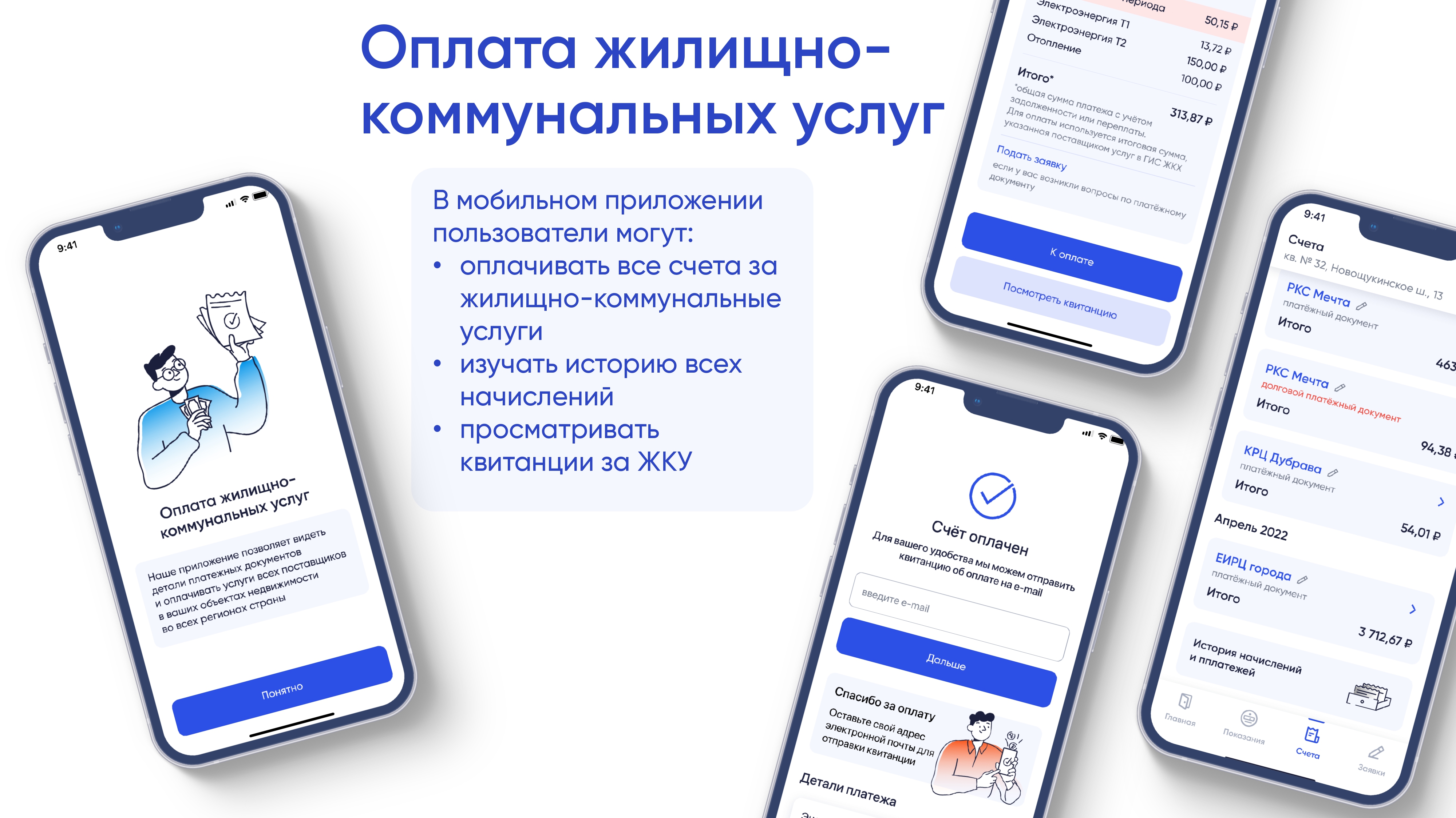 В разделе «Счета» собственник может посмотреть квитанцию и увидеть подробную расшифровку всех услуг, которые оплачивает. Кроме того, он может оплатить счет частично, введя нужное значение вручную. В разделе можно подать заявку в управляющую организацию, чтобы задать уточняющие вопросы о начислениях или прошлых платежах. Оплатить счета можно картой, MirPay (только для Android) или с помощью СБП.